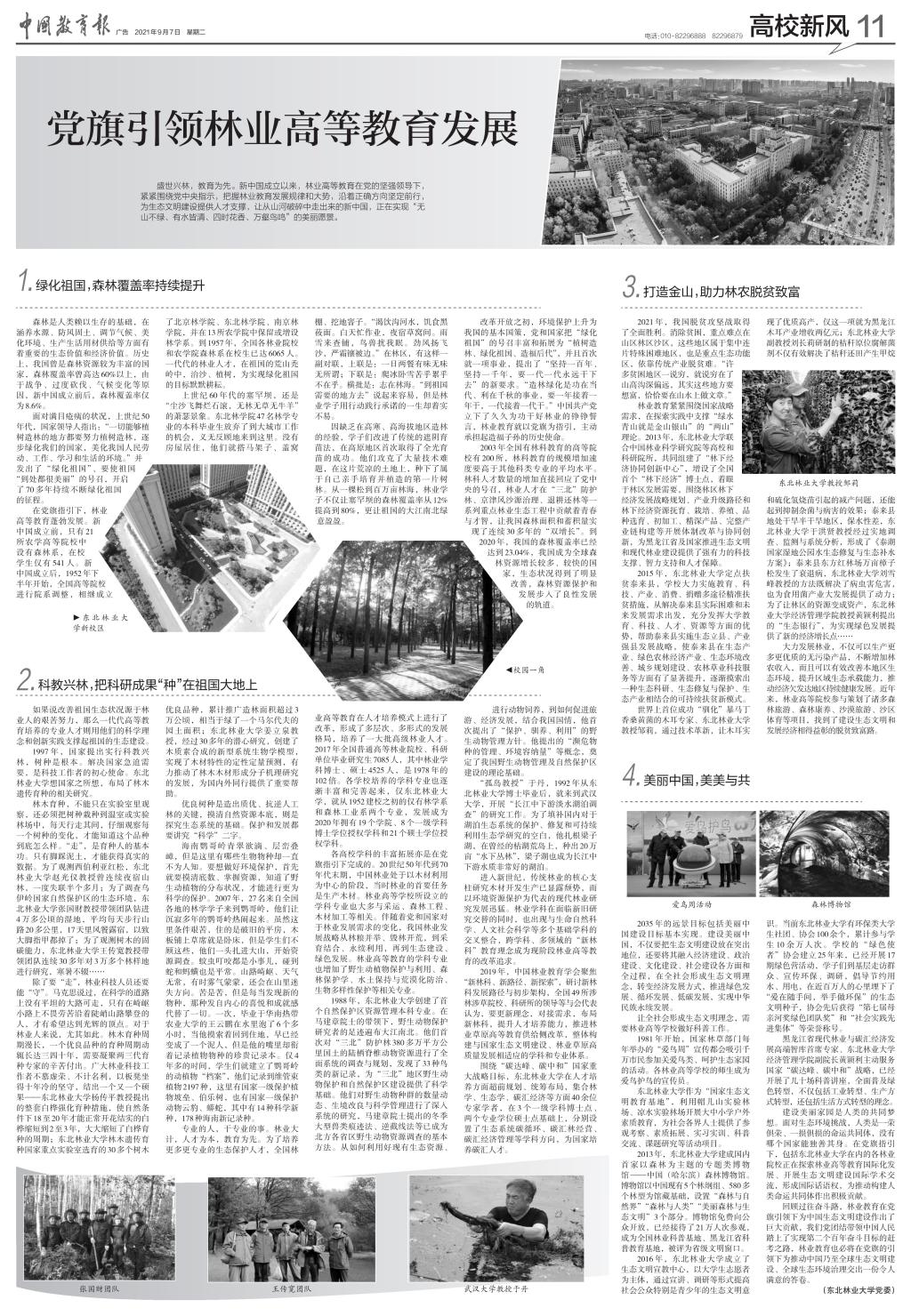 9月7日,中国教育报11版“高校新风”以《党旗引领林业高等教育发展》为题,整版刊登了东北林业大学党委撰写的林业高等教育在党旗引领下不断发展的文章。全文6000余字,从绿化祖国,森林覆盖率持续提升;科教兴林,把科研成果“种”在祖国大地上;打造金山,助力林农脱贫致富;美丽中国,美美与共四个板块,回顾了新中国成立以来,我国林业的发展道路,内容同时包括我校在此期间的重大参与以及为中国生态文明建设作出的巨大贡献,有力彰显了林业人的责任担当和绿色使命。
